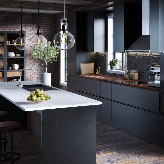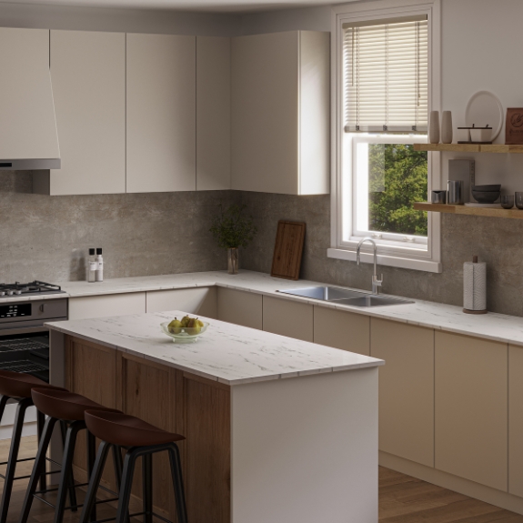 Stretta worktops are crafted with durable laminate surfaces and 100% pre-consumer recycled cores, making them both eco-friendly and high-performing.